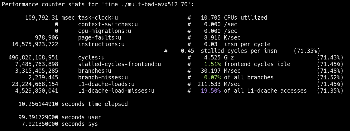 Notice the L1-dcache-load-misses for the “bad” workload is significantly higher as expected. More evidence is needed, but preliminary results seem to support my hypothesis.